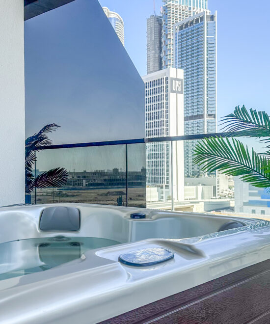 Private Balcony: The expansive balcony is your personal retreat, complete with a jacuzzi where you can soak in spectacular city views.