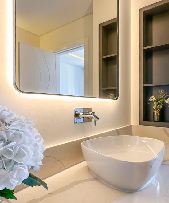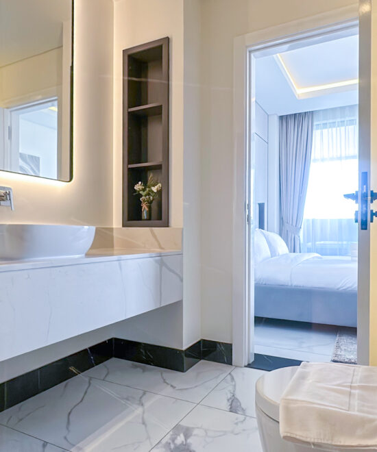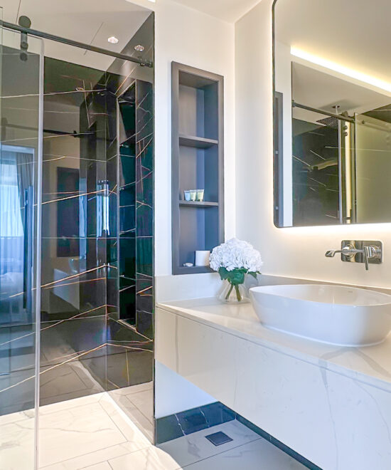 Luxurious Bathroom: Pamper yourself in the modern bathroom featuring a walk-in shower, premium fittings, and high-end toiletries.