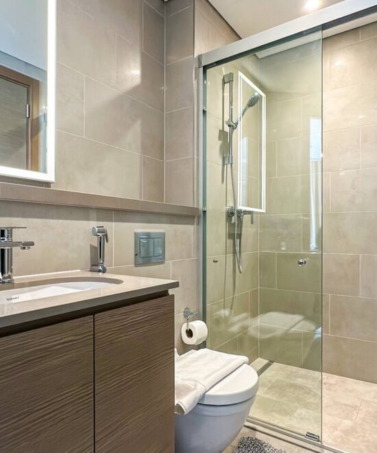 Two sleek bathrooms featuring walk-in showers, high-end fittings, and hotel-style toiletries.